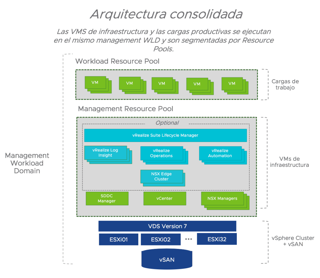 - Se hace uso de Resource Pools para segmentar los recursos entre cargas productivas y de gestión, pero estarán siendo ejecutadas en el mismo WLD.