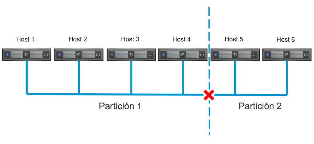 - Partition – En este caso dos o mas nodos pueden comunicarse entre ellos pero no con los demás nodos del cluster, por lo cual se terminan teniendo 2 o mas “particiones”/secciones de la red. En cada partición se elige un master: