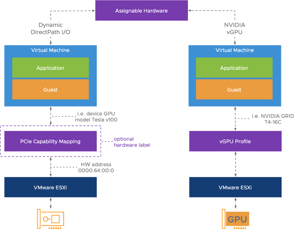 SR-IOV y VMDirectPath I/O usan los identificadores físicos o de hardware para hacer la asignación del dispositivo físico o una VF (virtual function, un instancia lógica del dispositivo) Assignable hardware tiene un enfoque mucho mas flexible, lo logra mediante la identificación de los atributos de estos dispositivos de hardware, sin incluir un identificador de hardware como tal. Esto permite crear una capa de abstracción extra.